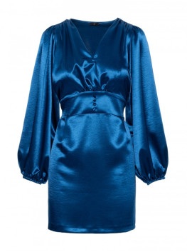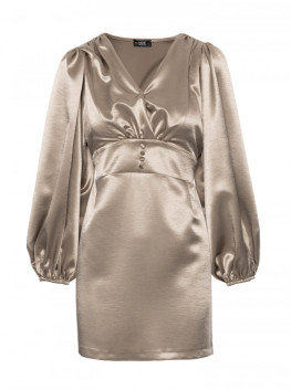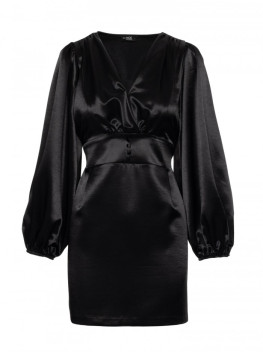 97% polyester 3% elastane MATERIAL Fabric: satin – smooth, glossy PRODUCT DETAILS Neckline: deep, wrap V-neck Sleeves: long, puffed, finished with elastic cuffs Waist: wide waistband with decorative buttons at the front, elastic at the back Skirt: straight, slightly fitted Fastening: none – slip-on design Pockets: none Lining: none Model: M888 Designed and made in Poland