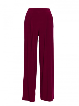 Burgundiškos spalvos kostiumėlis "M890" – tai elegantiškas derinys, susidedantis iš asimetriško, drapiruoto viršaus paaukštintu kaklu ir plačių, krentančių kelnių. Šis komplektas, pasiūtas iš švelnaus, tampraus trikotažo, ne tik patogus dėvėti, bet ir puikiai pabrėžia figūrą bei optiškai ilgina kojas. Kelnes puošia klostės ties juosmeniu, o šonuose įsiūtos patogios kišenės.