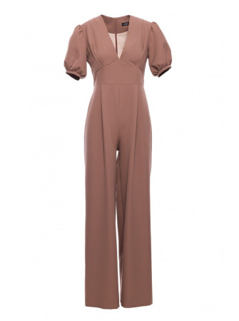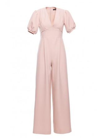 Švelnus pudros atspalvio kombinezonas sukuria rafinuotą ir įsimintiną įvaizdį. Plačios "vyskupo" rankovės su rankogaliais ir asimetriška iškirptė su skeltuku ant peties suteikia jam išskirtinumo. Šis kombinezonas – puiki alternatyva vakarinei suknelei, leisdama jums spindėti bet kokia proga.