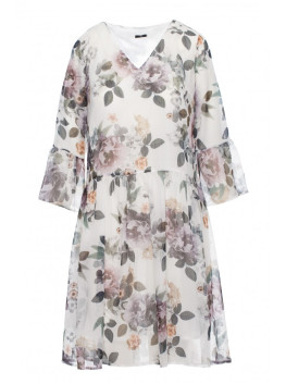 Lengva ir gėlėta šifono suknelė S214 – puikus pasirinkimas karštoms dienoms! Laisvo silueto, pažemintu liemeniu ir trimis ketvirčiais rankovių suknelė leis jums jaustis elegantiškai ir patogiai. Suknelė yra iki kelių, su pamušalu. Sudėtis: 100% poliesteris.